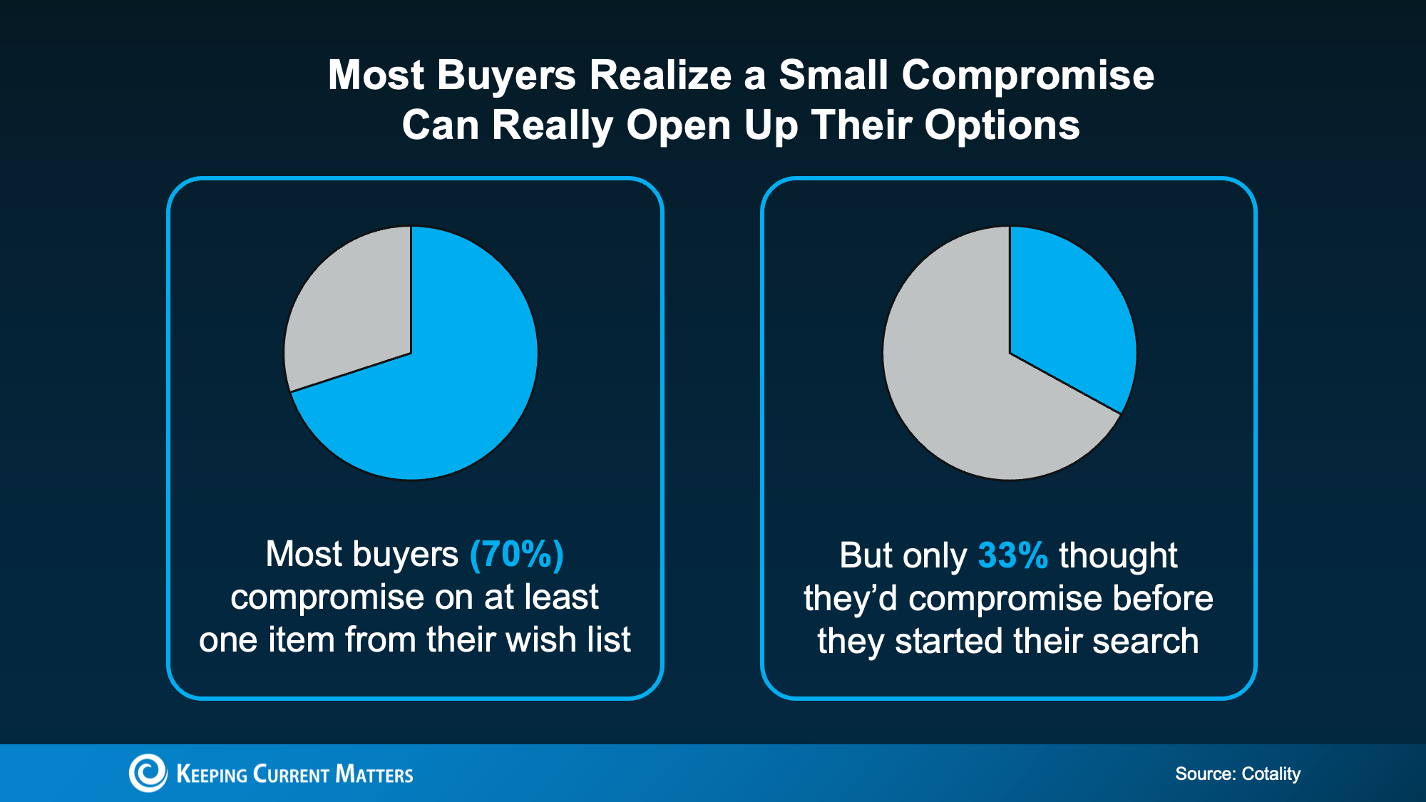 The data shows more buyers are using that strategy to offset affordability hurdles in today’s market. A recent study from Cotality found most buyers (70%) ended up compromising on one or more items from their original wish list. But before they started searching, only 33% expected to compromise at all: